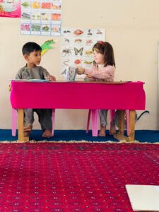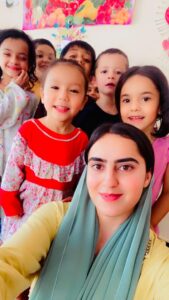 My name is Rohina Niazi and I am a teacher at Bagh Gulha Kindergarten [the Persian name for the Garden of Flowers Montessori Preschool]. I started university in 2016. I graduated from Kabul University of Education in 2018 with a degree in English Literature. And in April 2023, I started working at Bagh Gulha Kindergarten, which teaches using Montessori methods to children ages 3-6.
